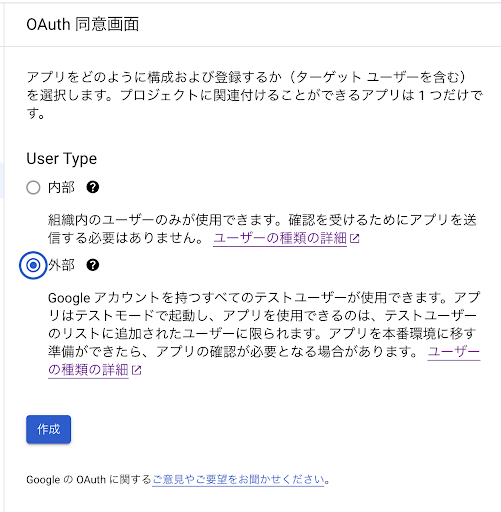 するとOAuth同意画面の作成画面に遷移します。 User Typeで「外部」を選択して「作成」ボタンを押下してください。