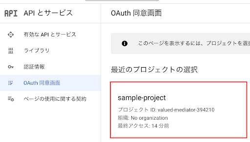 OAuth同意画面に遷移して、先ほど作成したプロジェクトを押下して選択してください。 先ほどのホーム画面から「APIとサービス」を押下した先の「OAuth同意画面」からも遷移可能です。