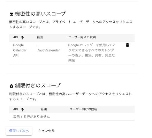 すると、元のページの「機密性の高いスコープ」の所に先ほど選択したスコープが確認できるかと思います。 確認ができたら「保存して次へ」を押下してください。