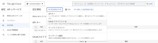 最後に、Railsの内部で使用するOAuthクライアントIDを発行します。 先ほどの画面のサイドナビから「認証情報」を押下して、画面上部の「認証情報を作成」から「OAuthクライアントID」を選択してください。