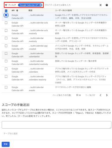 ハーフモーダルを表示させると「フィルタ」の横にテキスト入力欄があるので、そこに「Google Calendar API」と入力します。 するとGoogleカレンダーに関連するスコープの一覧がフィルタリングされて表示されます。 今回は予定の登録・更新・削除を行いたいため「../auth/calendar」を選択します。 チェックボックスを選択したら、モーダル最下部の「更新」を押下してください。