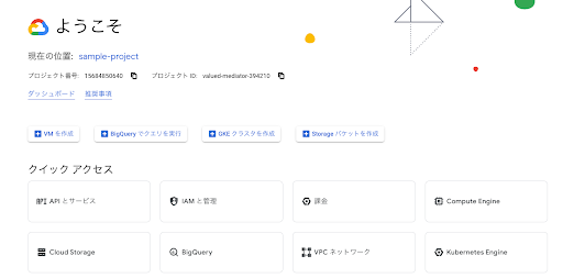 するとGoogle Cloudコンソールのホームに遷移して、先ほど作成したプロジェクトが選択された状態になっています。