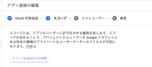 スコープの設定画面へ遷移します。 スコープとは、ユーザーに許可してもらうリソースの使用権限の範囲のことで「〇〇が次の許可をリクエストしています」の「次の許可」に該当する部分です。 スコープの詳しい説明に関してはGoogle APIのOAuth 2.0 スコープGoogle APIのOAuth 2.0 スコープを参考にしてください。
