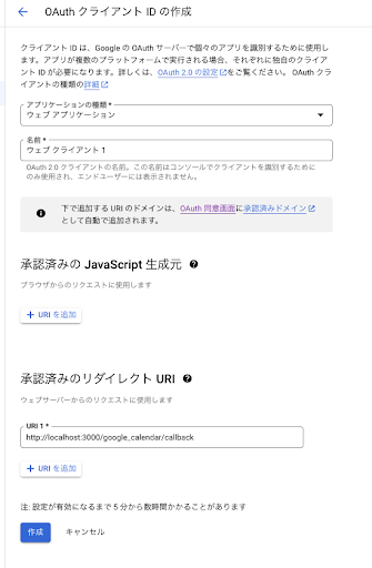 ローカル環境で試す場合は、ドメインは「localhost」で問題ありません。 パスは任意で構いませんが、慣例的に「〇〇/callback」とすることが多いようです。 今回はhttp://localhost:3000/google_calendar/callbackとして設定します。 入力ができたら「作成」を押下して次に進みます。