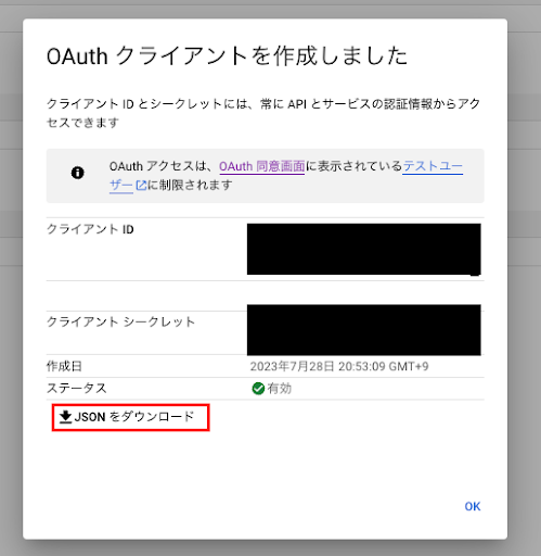 必要なのはJSONファイルなので、「JSONをダウンロード」を押下して、JSONファイルをダウンロードしてください。 ダウンロードができたら「OK」を押下します。