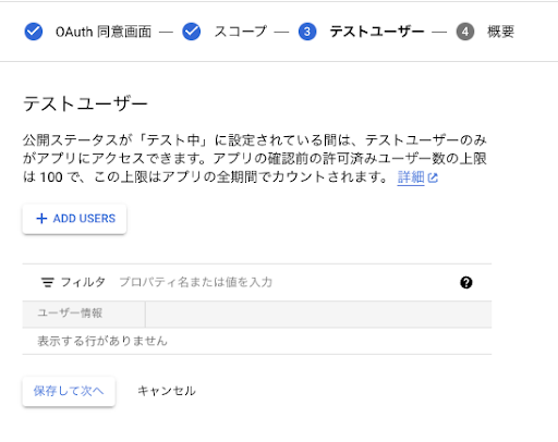スコープの設定画面へ遷移します。 スコープとは、ユーザーに許可してもらうリソースの使用権限の範囲のことで「〇〇が次の許可をリクエストしています」の「次の許可」に該当する部分です。 スコープの詳しい説明に関してはGoogle APIのOAuth 2.0 スコープGoogle APIのOAuth 2.0 スコープを参考にしてください。