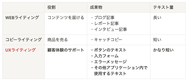 以下の図はライティングの種類とそれぞれの役割、ライティングが使われる場面、テキスト量を表にしました。 今回は以下のライティングの中でもUXライティングにフォーカスを当てて紹介します。