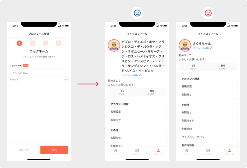 最初に聞くことの多い、ニックネームやユーザーネーム。 自由入力で記述してもらうのが一般的ですね! ここで注意したいのは最大入力数の設定が必要ということです。 プロフ登録するということは、マイページや、ユーザー詳細画面に掲載されるのが一般的です。 最大文字数を設定していないとマイページにとんでもない数の文字が表示されてしまう可能性があります!文字数の仕様はエンジニアさんと話し合って決めるのが一番ですが、ユーザーネームの場合15文字〜20文字が多いですね。 入力した項目が、どこでどのように表示されるのか意識すると良いデザインが作れると思います!