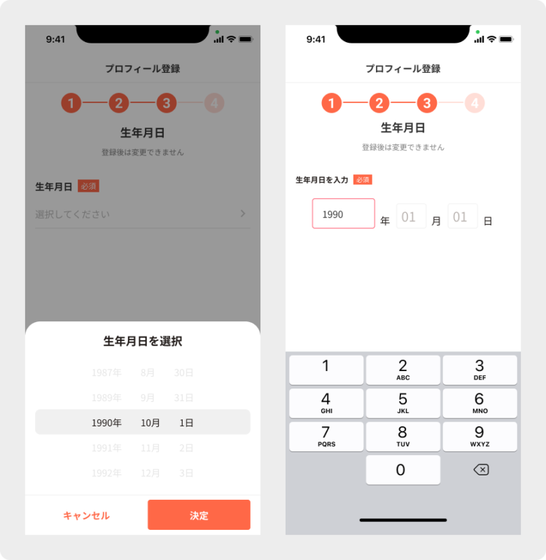 生年月日も入力する機会が多い項目ですね! デフォルトの西暦はサービスの利用者やターゲットに合わせた年代に設定するようにしましょう! (例)10代・20代が対象のサービス→2000年 / 30代〜50代が対象のサービス→1980年 また、入力方法は直接数字を入れるのと、ドラムロールの2つの方法が一般的です! 画面から遷移させて入力させたい場合はドラムロール、画面遷移なしで入力して欲しい場合は直接入力が良さそうですね!